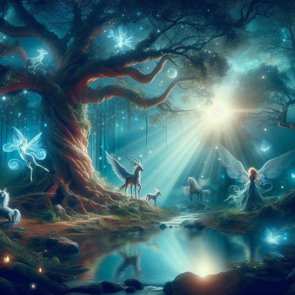 Requête : Imaginez une forêt éthérée et mystique baignée d'une douce lumière. L'élément central est un majestueux arbre ancien aux branches étendues et au feuillage luxuriant et coloré qui semble scintiller de magie. De ses branches pendent des lanternes délicates et lumineuses qui projettent une lumière douce sur la scène en dessous. Autour de l'arbre, une variété de créatures fantastiques se rassemblent en harmonie : des fées éthérées aux ailes iridescentes, des licornes majestueuses aux crinières fluides, et des figures sages et encapuchonnées qui suggèrent des sorciers ou des druides. Le sol est tapissé de mousses vibrantes et de fleurs qui scintillent subtilement, comme saupoudrées de poussière de fée. Un ruisseau tranquille serpente à travers la scène, reflétant l'enchantement au-dessus. À l'arrière-plan, la forêt se fond dans une brume onirique, avec des indices de plus d'êtres magiques et de faibles lueurs de lumière suggérant un monde débordant d'enchantement et de merveilles.