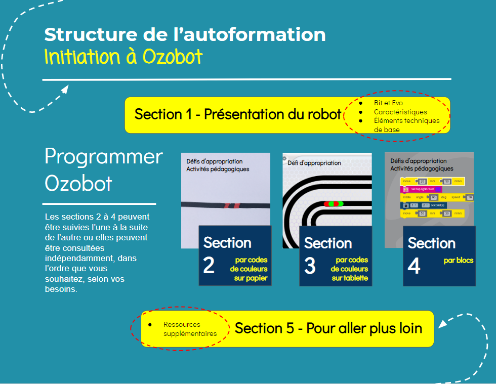 Selon vos besoins, vous pourrez consulter une ou des sections de l’autoformation. Il est aussi possible de consulter le contenu d'une section, d'expérimenter en classe, puis de consulter une autre section lorsque vous vous sentirez prêt à ajouter un autre volet d’Ozobot à votre enseignement. L'autoformation débute par la présentation du robot en abordant ses caractéristiques et des éléments techniques de base (section 1). En fin de parcours, des ressources supplémentaires sont aussi listées pour ceux qui souhaiteraient aller plus loin (section 5). En cours de route, des activités d’appropriation (défis) vous seront proposées. Vous pourrez réutiliser ces défis en classe avec vos élèves. De plus, des activités à réaliser en classe ciblant des contenus du PFEQ et de la PDA dans différentes disciplines vous sont aussi partagées.