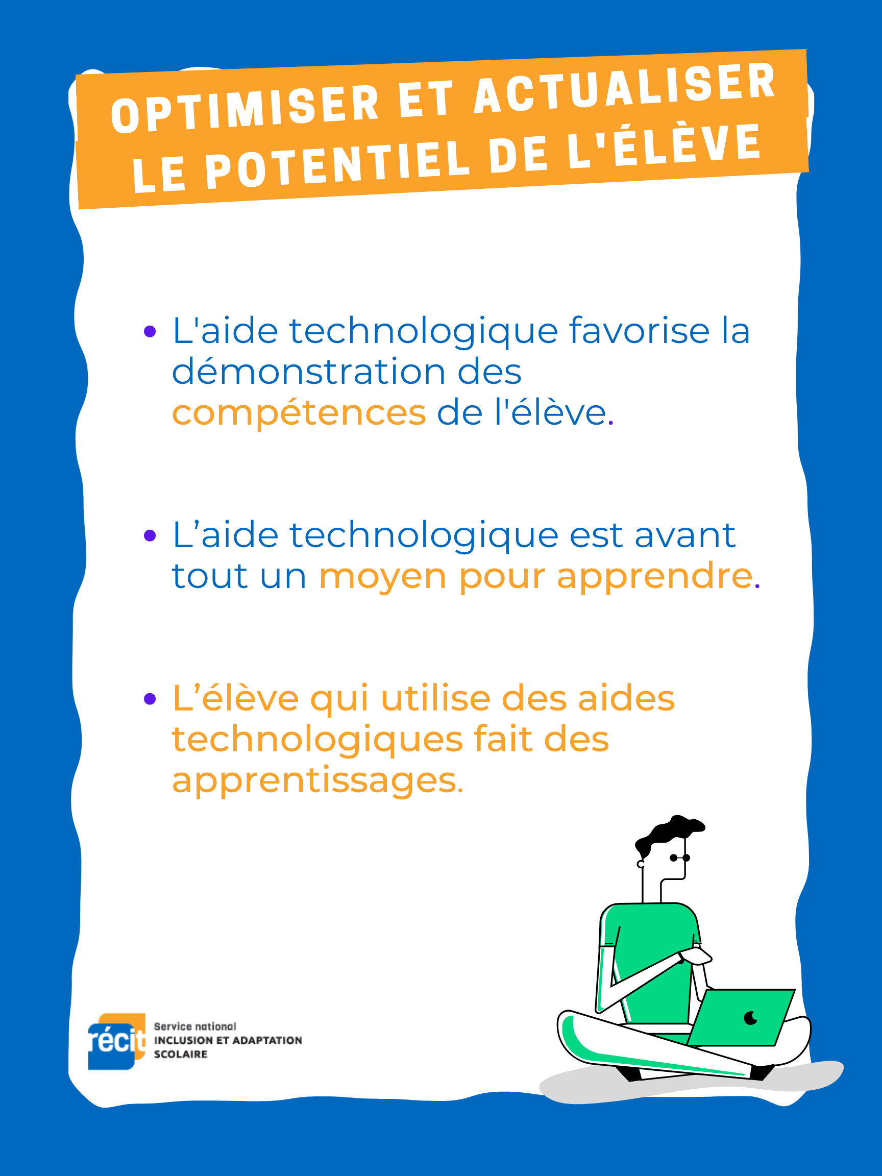 De plus en plus d'élèves de nos classes régulières utilisent un appareil numérique sur lequel des fonctions d'aide sont disponibles, leur permettant ainsi d'accéder et de produire des contenus scolaires. Il arrive que l'utilisation de ces dispositifs numériques soit encore mal comprise par les intervenants scolaires. Par cette activité, vous serez en mesure de pouvoir décrire dans vos mots ce qu'est une fonction d'aide en milieu scolaire.