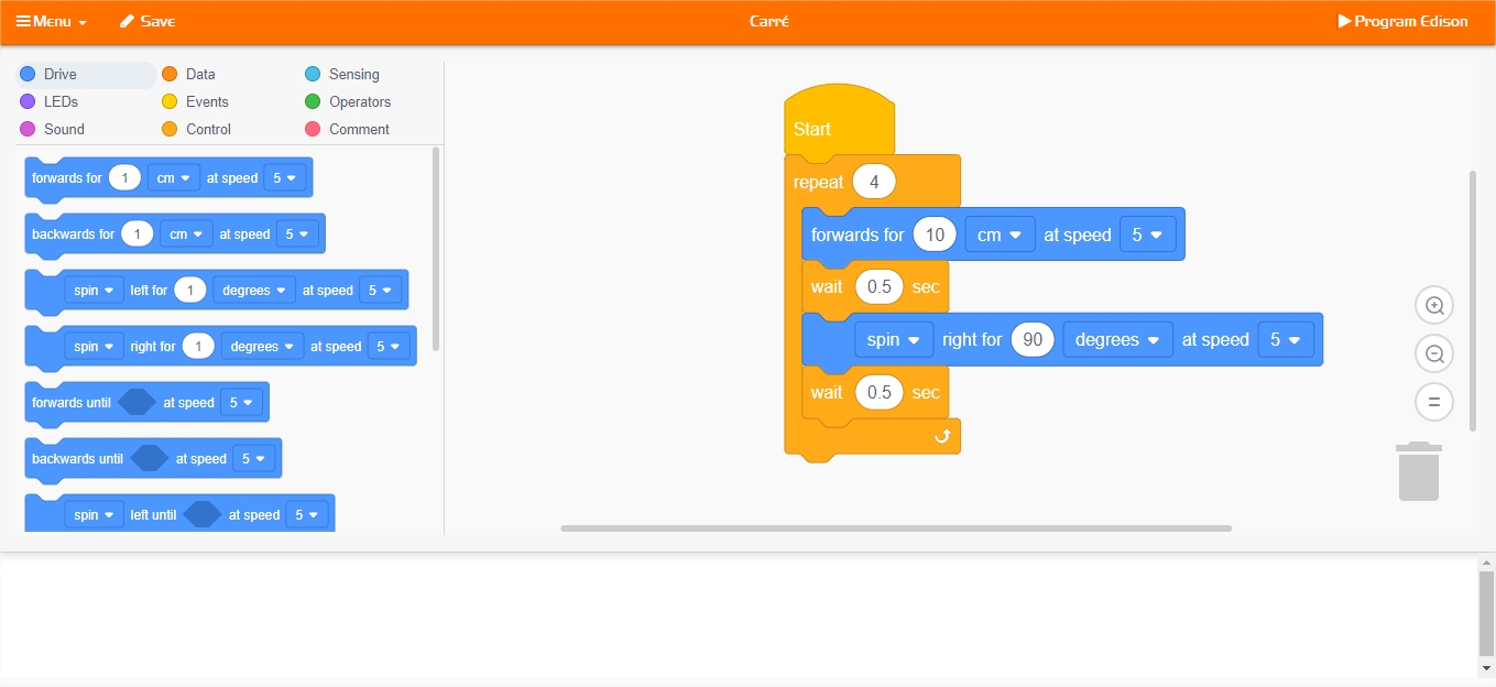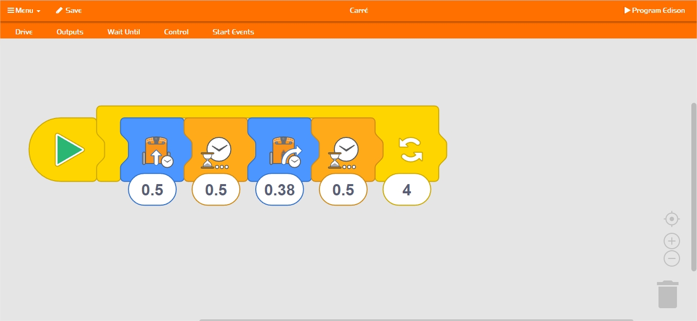 Dans ce défi, vous devrez faire réaliser une forme géométrique à votre robot.  Nous commencerons avec un carré et par la suite, vous pourrez réaliser d'autres formes.  Nous utiliserons les blocs de mouvements, les blocs d'attente ainsi que les blocs de boucles. Bon défi!