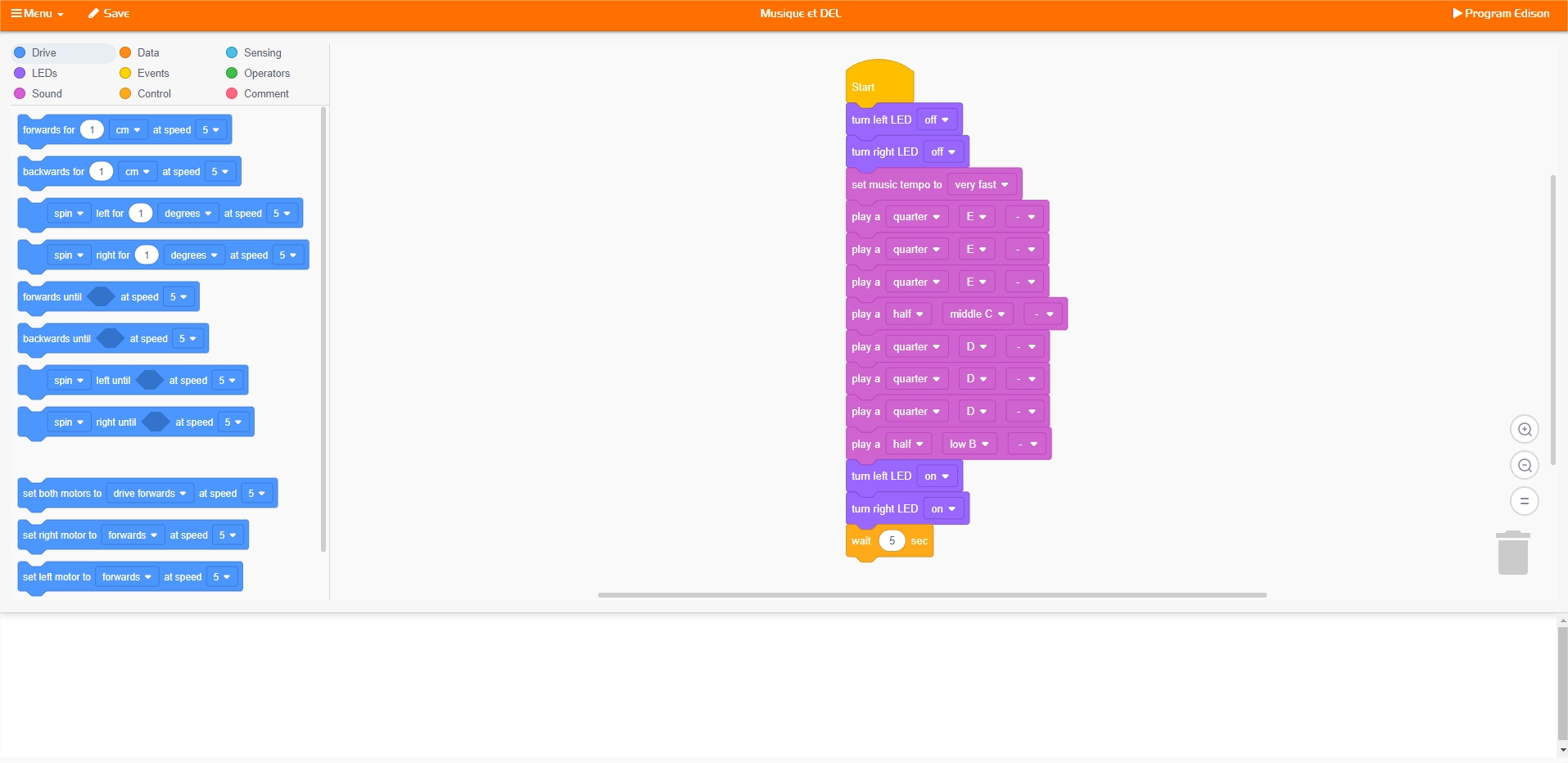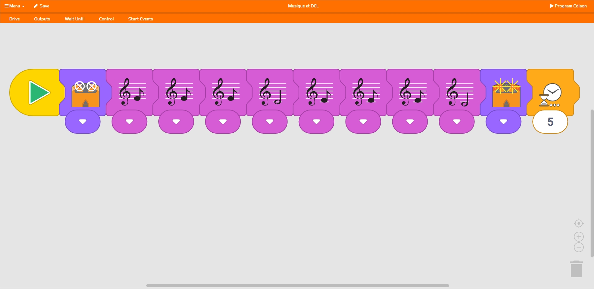 Dans ce défi, votre robot devra jouer de la musique et activer ses lumières DEL. Nous commencerons avec la symphonie no. 5 de Beethoven et par la suite Frère Jacques. Nous utiliserons les blocs de sons, les blocs de lumière ainsi que les blocs de boucles. Bon défi!