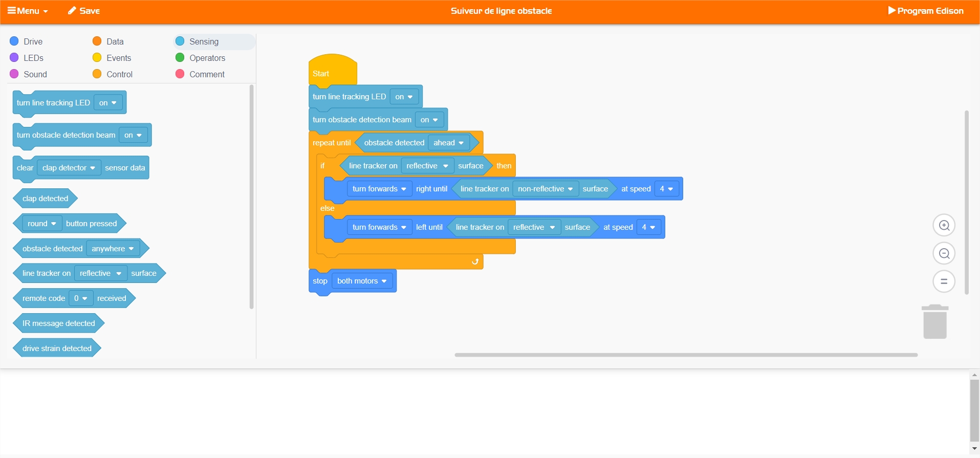 SOLUTION possible pour le code EdBlocks défi 3 - suivre une ligne et arrêter si un obstacle