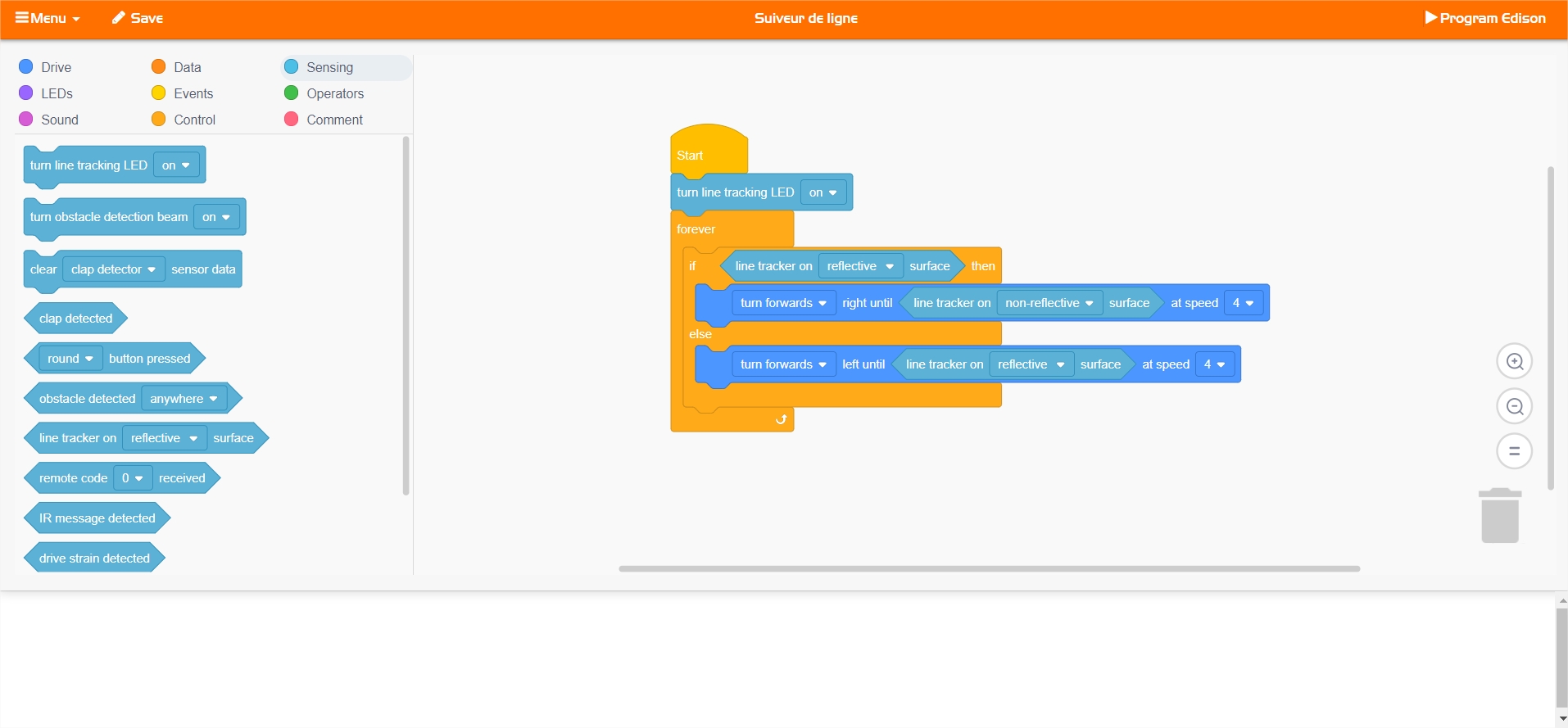 SOLUTION possible pour le code EdBlocks défi 3 - suivre une ligne