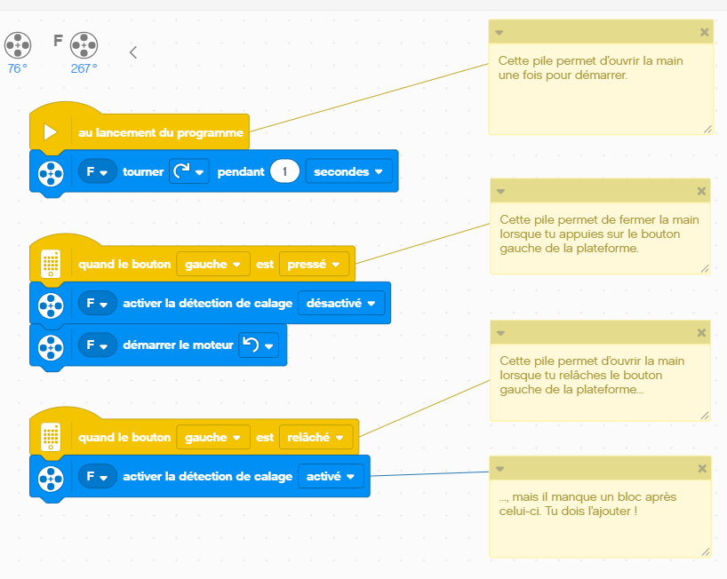 Voici les blocs proposés pour réaliser le programme  Brique après brique. Les blocs et la vidéo s'ouvrent en cliquant sur le mot commencer à droite du titre. Le bouton commencer est à droite du titre.