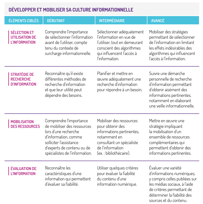 « Sensibilité relative à la façon dont on recueille, utilise, gère, synthétise et crée du contenu de façon éthique. Cela inclut les habiletés relatives à la manipulation de l’information telles que la détermination du besoin, l’accessibilité, la localisation, la compréhension et la production d’information, y compris la production collaborative et le partage au sein d’environnements numériques permettant de le faire efficacement. » Cadre de référence de la compétence numérique, p.29