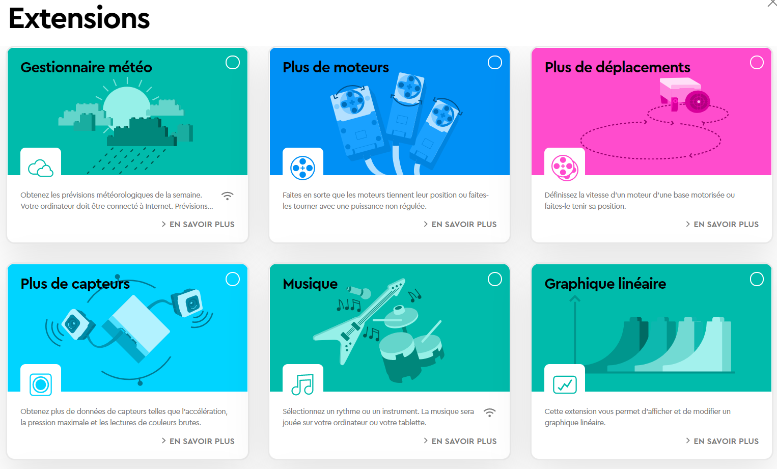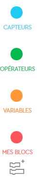 Il sera aussi nécessaire d'ajouter les extensions de déplacement pour avoir accès aux blocs roses. Il faut choisir le logo Blocs avec + en bas à gauche comme le montre l'image de droite. Par la suite, sélectionnez le cercle de l'extension choisie afin qu'il devienne bleu et les blocs seront ajoutés dans l'application.
