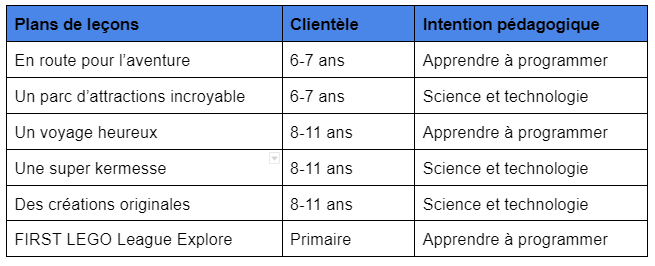 Des ressources produites par LEGO sont disponibles dans la section « Éducation » de leur site sous forme des plans de cours complets. Chaque cours comprend plusieurs activités. Un guide d'animation comprend des astuces d'utilisation de blocs de programmation, les principaux objectifs, les normes pédagogiques et dans la section des ressources supplémentaires, il y a les instructions de montage et même des suggestions de pistes d'évaluation. C'est tout ce dont vous avez besoin pour susciter la curiosité et l'imagination des jeunes avec l'approche STEAM. Utiliser les filtres pour sélectionner le robot, le niveau et la discipline des plans de leçons.