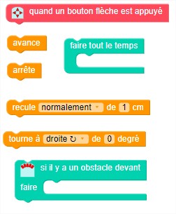 À l’aide de ses capteurs et des blocs contrôles, nous allons rendre Thymio davantage autonome dans ses déplacements. Vous devez programmer Thymio afin qu’il avance continuellement, mais que s’il rencontre un obstacle, il doive reculer de 15 cm et tourner à droite de 45° avant de poursuivre sa route.