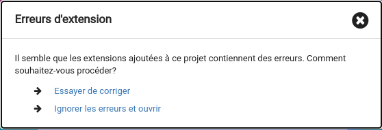 Lorsque ça fait longtemps que vous avez ouvert un programme dans MakeCode ou que vous ouvrez un programme que quelqu'un vous a partagé, il est parfois possible que vous ayez un message d'erreur d'extension qui apparaisse (voir ce programme).