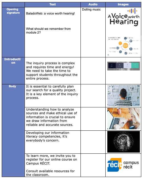 There are many models of storyboards you could choose from to plan your podcast. We invite you to plan you storyboard using one of the following model. You can create a copy of these models and adapt them to your needs.