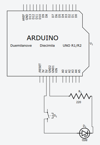 Comme première tâche à réaliser avec le matériel Arduino, nous vous proposons de réaliser ce petit circuit (garder ce montage pour le prochain défi). La résistance de 220 Ω sert ici à ne pas envoyer trop de courant dans la DEL.