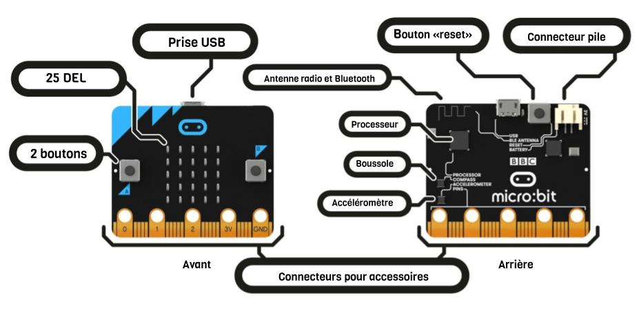 Bien que le Micro:bit soit assez simple d'utilisation (https://microbit.org/fr/guide/quick/), il contient plusieurs éléments intéressants pour créer des projet de «robotique» et de programmation.