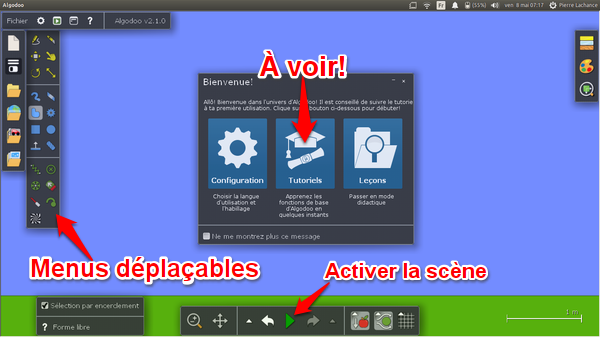Démarrer Algodoo et cliquer partout dans l’interface afin de trouver les menus, l’aide, comment enregistrer une scène, comment ajouter des objets (cercle, engrenages, ressort…) etc.