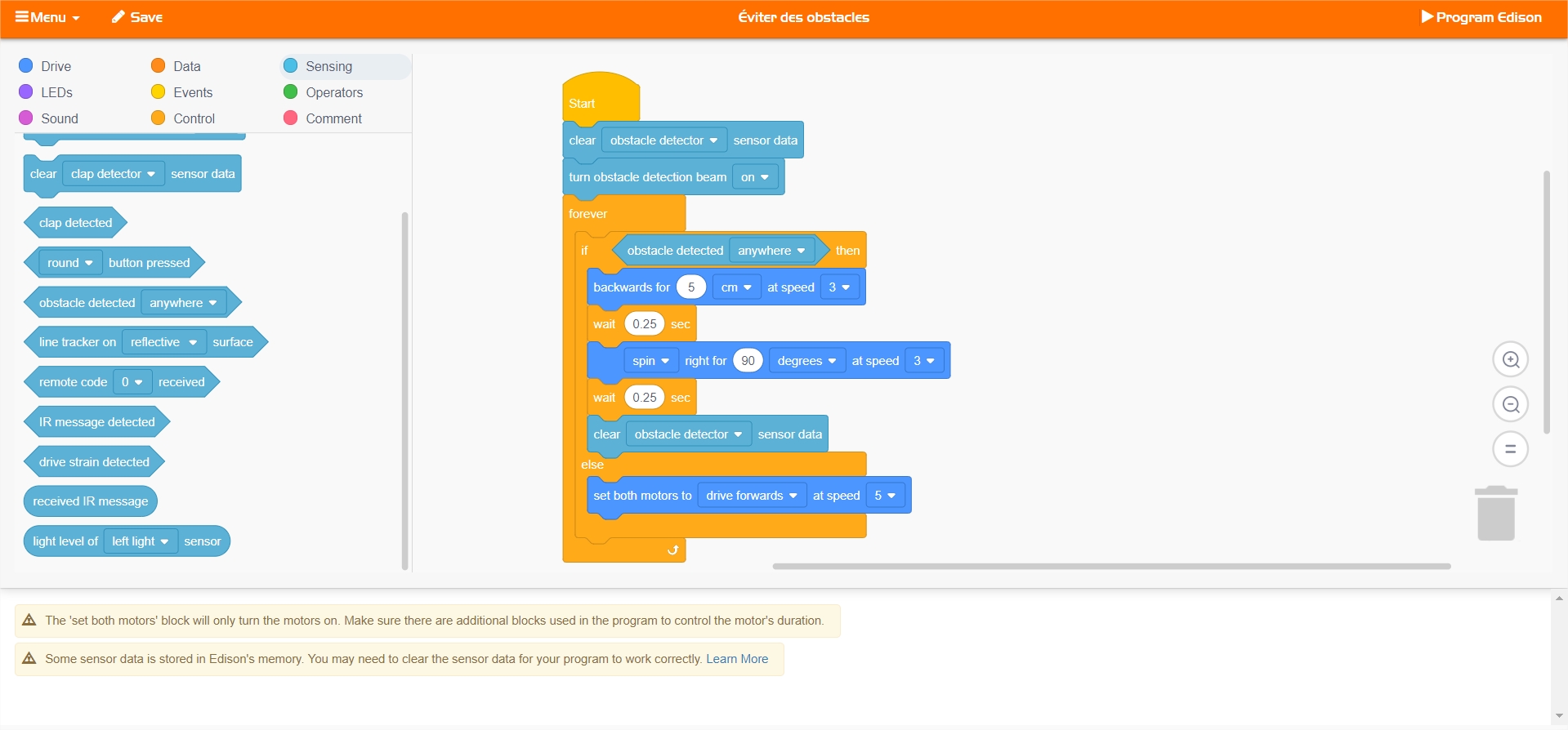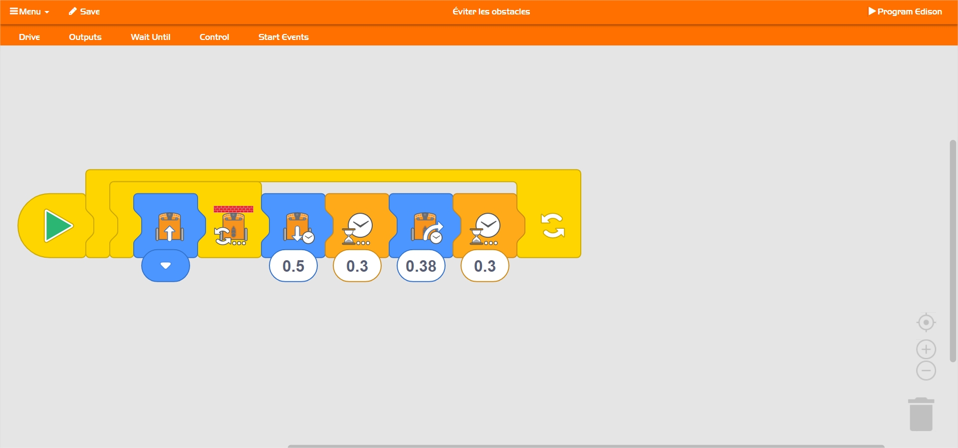 SOLUTION possible pour le code EdBlocks défi 4 - éviter des obstacles