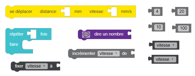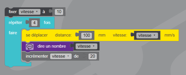 - À chaque déplacement, il augmente sa vitesse de 20 mm/sec. Sa vitesse de départ est de 10 mm/sec.