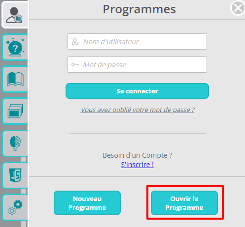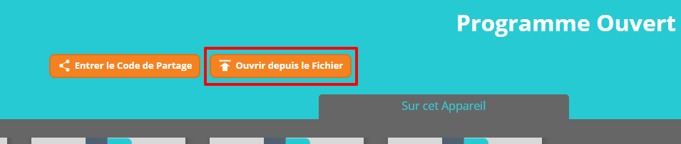 1. Pour télécharger un programme enregistré hors Ozoblockly, cliquez sur Ouvrir le programme (dans l'onglet Programmes), puis sur le bouton Ouvrir depuis le fichier.