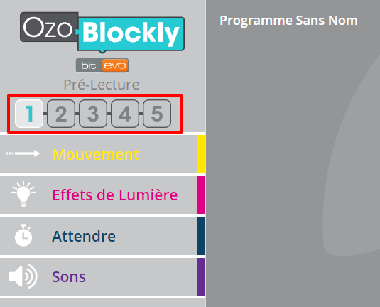 Rappel : Tel qu’abordé dans l’autoformation Premiers pas avez Ozobot, vous pouvez changer les niveaux de programmation en haut à droite de l’écran.