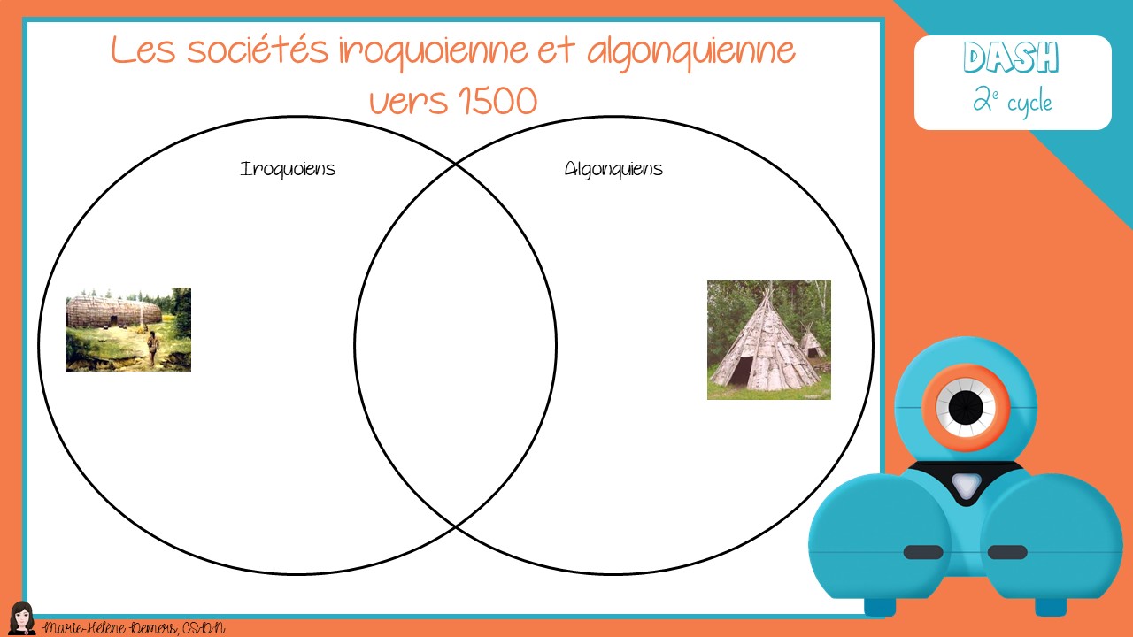 Après l’étude des sociétés iroquoiennes et algonquiennes vers 1500, vous pouvez tracer au sol deux grands cercles qui se superposent légèrement. Ensuite, déposez au sol des images qui se réfèrent à l’une ou l’autre des sociétés et même à deux à la fois. Fixez ces images sur un objet que Dash pourra facilement déplacer en les poussant comme un verre ou autre chose que vous avez sous la main. Demandez ensuite aux élèves de programmer Dash pour qu’il classe les images selon la ou les sociétés concernées.