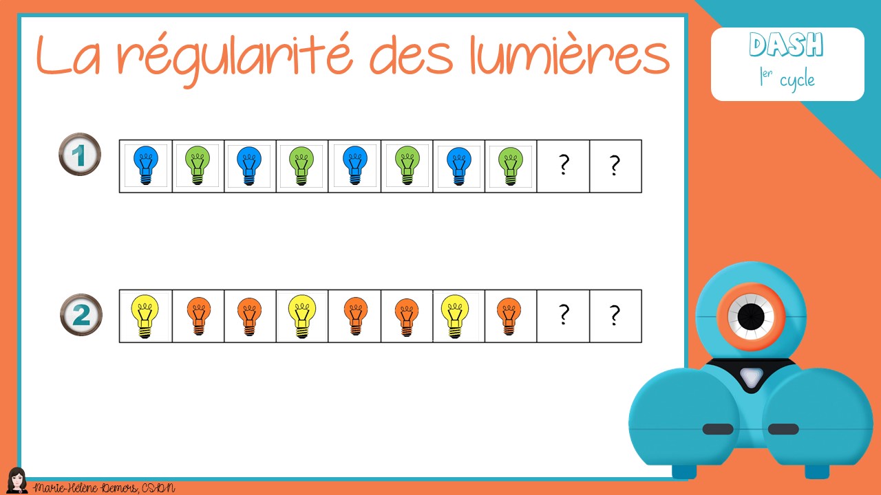 Variante un peu plus complexe  Placez au sol des images de lumières colorées. Faites-en une suite à compléter. Les élèves devront donc programmer Dash pour qu’il déplace sur les différentes images en allumant ses propres lumières et en complétant la suite avec les bonnes couleurs.