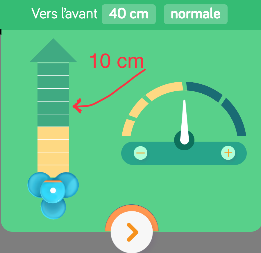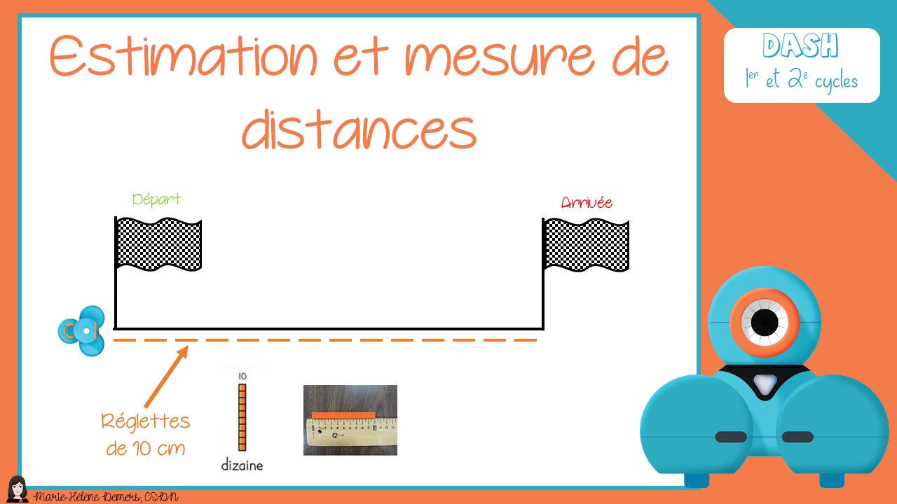 Dans un premier temps, demandez aux élèves d’estimer la distance qui séparer le point de départ au point d’arrivée en nombre de réglettes ou en cm selon le niveau où ils en sont. Par la suite, demandez-leur de mesurer avec les réglettes. Finalement, suggérez aux élèves de programmer Dash selon leur mesure estimée afin de valider leur réponse. Si vous n’en êtes pas encore aux cm, vous pourrez expliquer aux élèves que chaque petite ligne de la flèche correspond à une réglette.