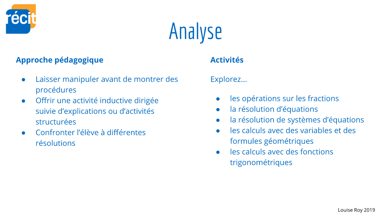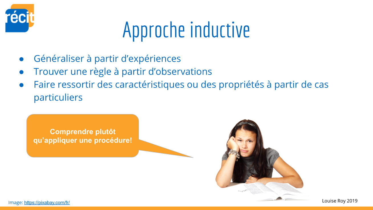 Varier l'utilisation d'objets numériques passe également par la façon dont nous la proposons aux élèves. Avant ou après une leçon par exemple. L'approche inductive place l'élève dans un contexte plus actif, elle lui donne un rôle de « chercheur » plutôt que de lui demander d'appliquer des procédures. Voici quelques éléments expliquant cette approche (tirés de cette présentation de Louise Roy du RÉCIT MST).