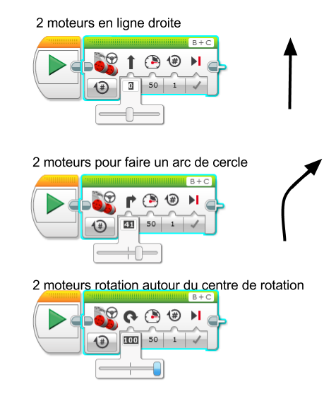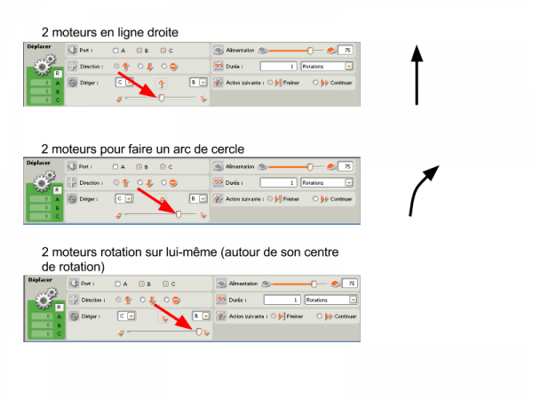 - Cas ligne droite : le curseur de «synchronisation» des moteurs est au centre, donc lorsque le moteur B fait 1 rotation dans un sens, le moteur C fait lui aussi 1 rotation dans le même sens.